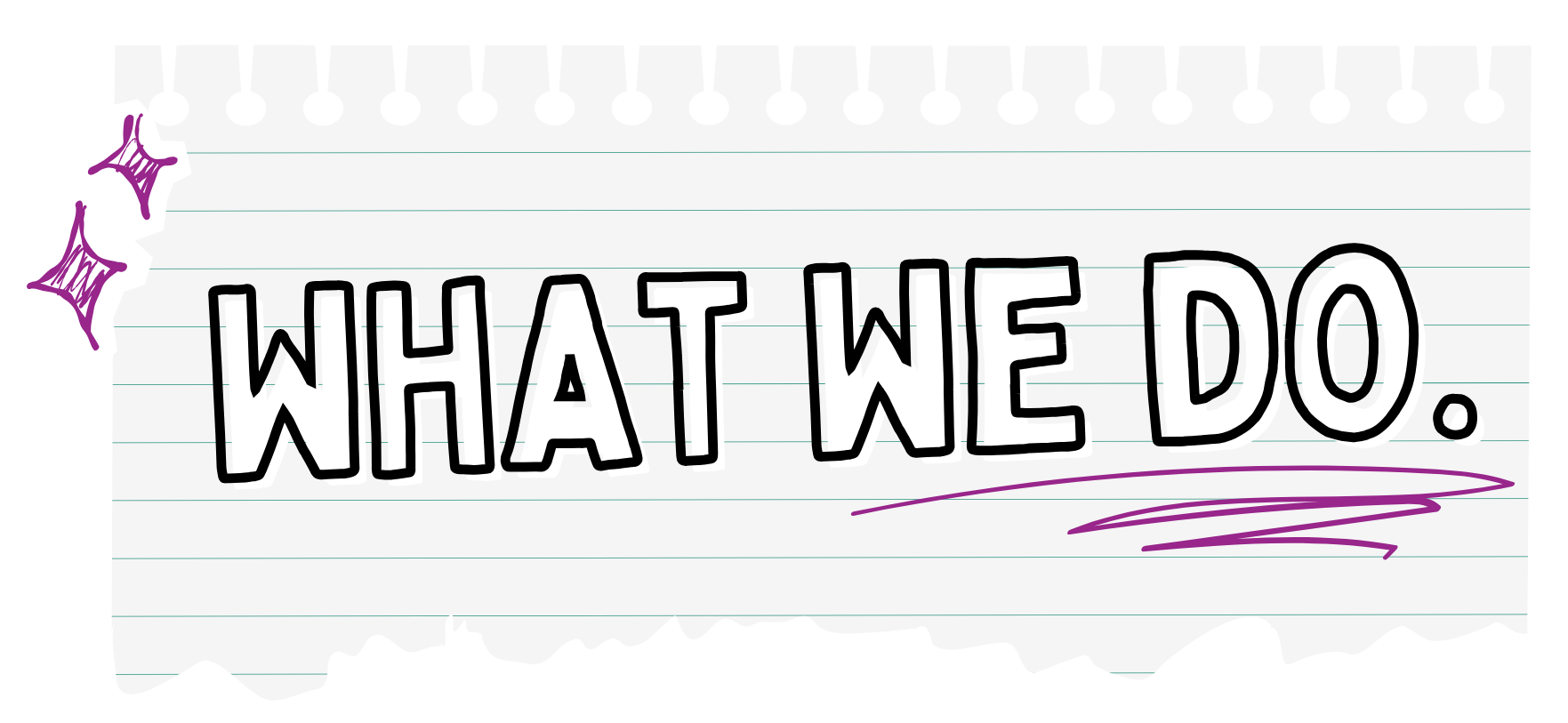 Notecard with torn edges, features handwritten text 'WHAT WE DO.' in large, bold black and white letters, purple underlining, and purple doodles in the margins.