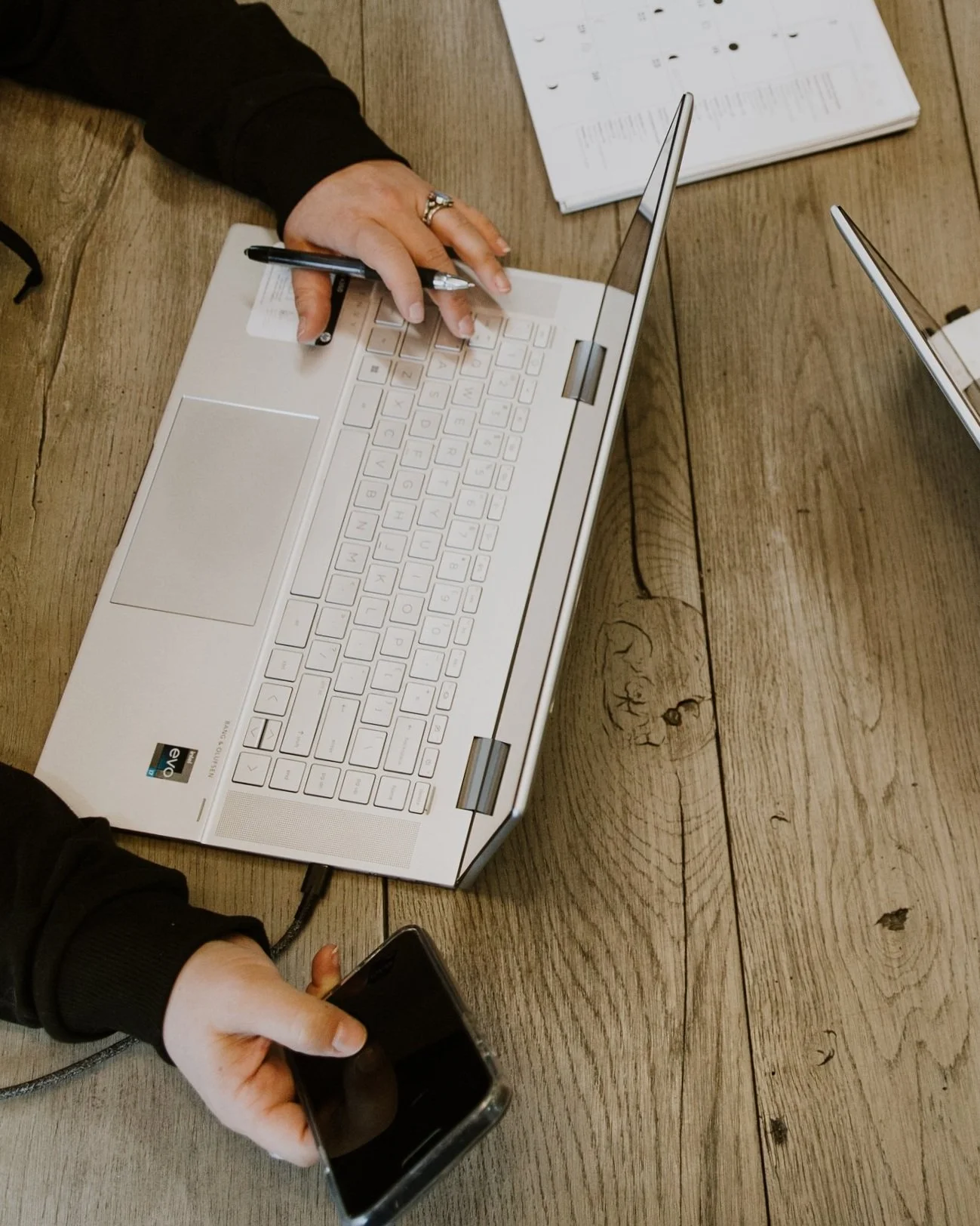 Person using a white laptop with a black pen in hand, holding a smartphone, sitting at a wooden table with papers and documents nearby.